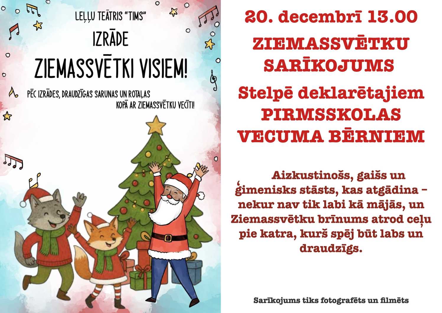 20. decembrī 13.00 ZIEMASSVĒTKU SARĪKOJUMS STELPĒ DEKLARĒTAJIEM PIRMSSKOLAS VECUMA BĒRNIEM