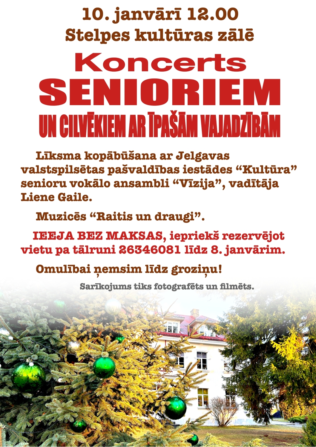 IEEJA BEZ MAKSAS, iepriekš rezervējot vietu pa tālruni 26346081 līdz 8. janvārim.