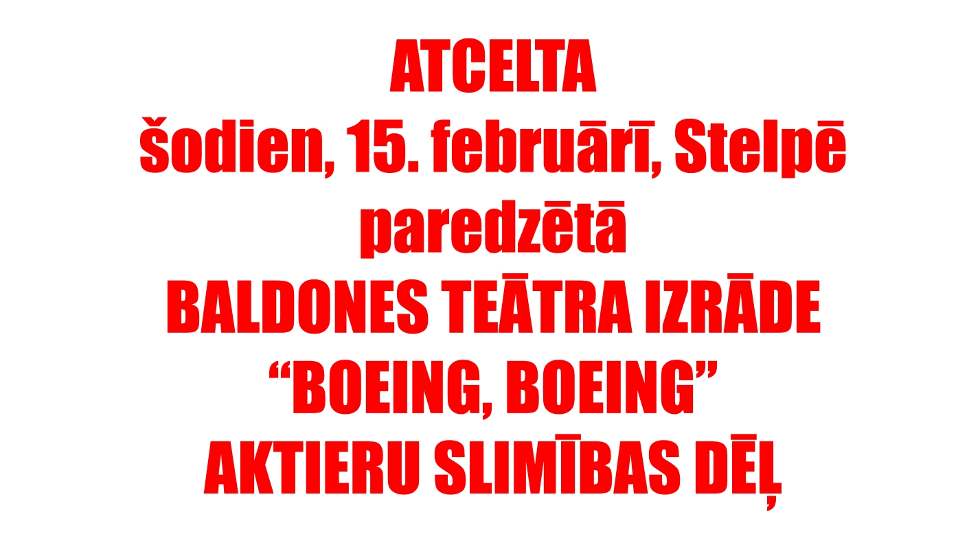 ATCELTA šodien, 15. februārī paredzētā Baldones teātra izrāde BOEING, BOEING aktieru slimības dēļ.