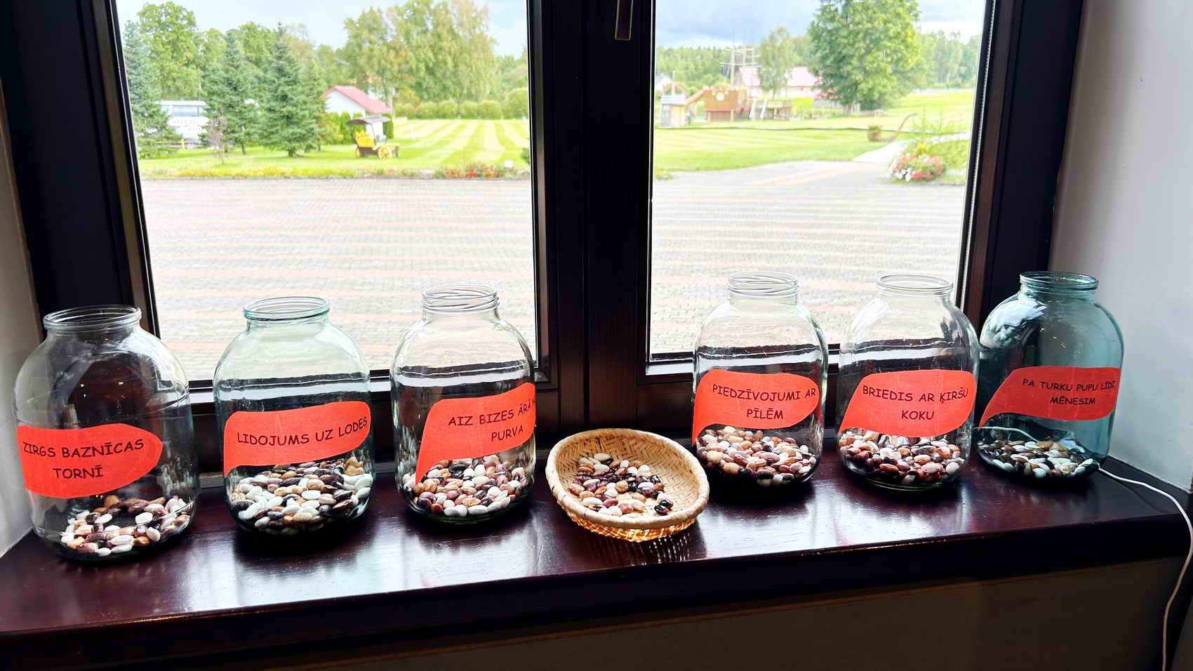 Kad esam iestiprinājušies, sākas konservēto produktu degustācija. Piedāvājums ir daudzveidīgs – tomāti želejā, ķirbju salāti “Sievasmātes mēle”, tomātu mērce pēc Mārtiņa Sirmā receptes un pat ievārījums no sausserža ogām!