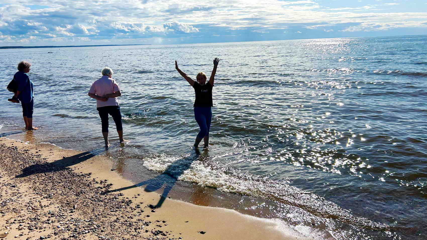 Neticami drīz mūsu prasmīgais šoferītis Ilmārs Ancveirs atrod autobusam vietu, un mūsu basās kājas iegrimst Saulkrastu pludmales siltajā smiltī. Mūsu vidū nudien atrodas arī peldētāji. Tomēr vairāk gan ir to, kas izmanto šo brīdī, lai, vērojot sauli uz rietu ejam, baudītu kafiju, saldējumu vai citu uzkodu. Arī vienkārši piesēst un brīdi patērzēt šķiet gana patīkami.
