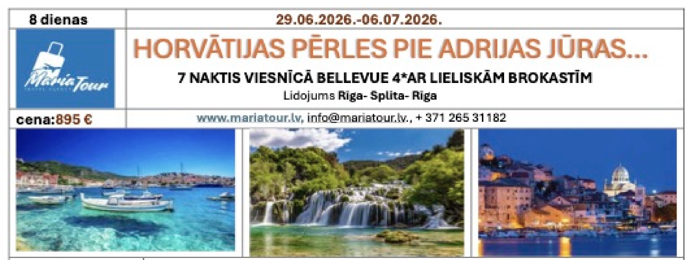 Baudīsim ezerus un ūdenskritumus Krka un Plitvices dabas parkos. Izstaigāsim senās pilsētas Splitu, Šibeniku un Zadaru. Vienā no siltajām dienvidu naktīm kāpsim uz kuģīša, lai, iespējams, sastaptu jūras zvaigznes, jūras ežus, jūras gurķus un citus piekrastes ūdeņu iemītniekus.